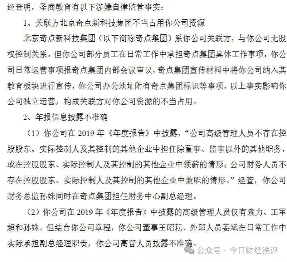 在监管层面,圣商教育并非完全未被触达。2021年2月,创新层公司圣商教育因关联方资源占用、年报披露不准确,被全国中小企业股份转让系统责令改正。公告指出,其与关联方北京奇点新科技集团存在办公地址共用、资源交叉等事项。