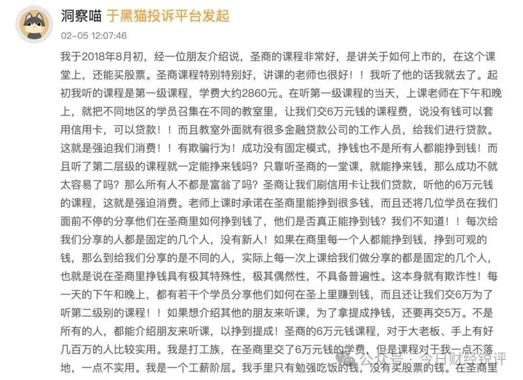 黑猫投诉平台显示,今年2月,有消费者称自己在2018年8月在朋友推荐下参加了圣商教育的初级课程。在课程当天,授课老师及工作人员即通过营造紧迫感、现场提供贷款服务等方式,诱导该消费者当场支付6万元高级课程费用,承诺听课就能赚钱、并可通过推荐他人获取高额提成,但这些承诺与其后续的实际体验严重不符,其盈利模式也非其所宣称的普遍有效,认为圣商教育存在欺诈和强制消费行为,要求全额退款,但至今无果。
