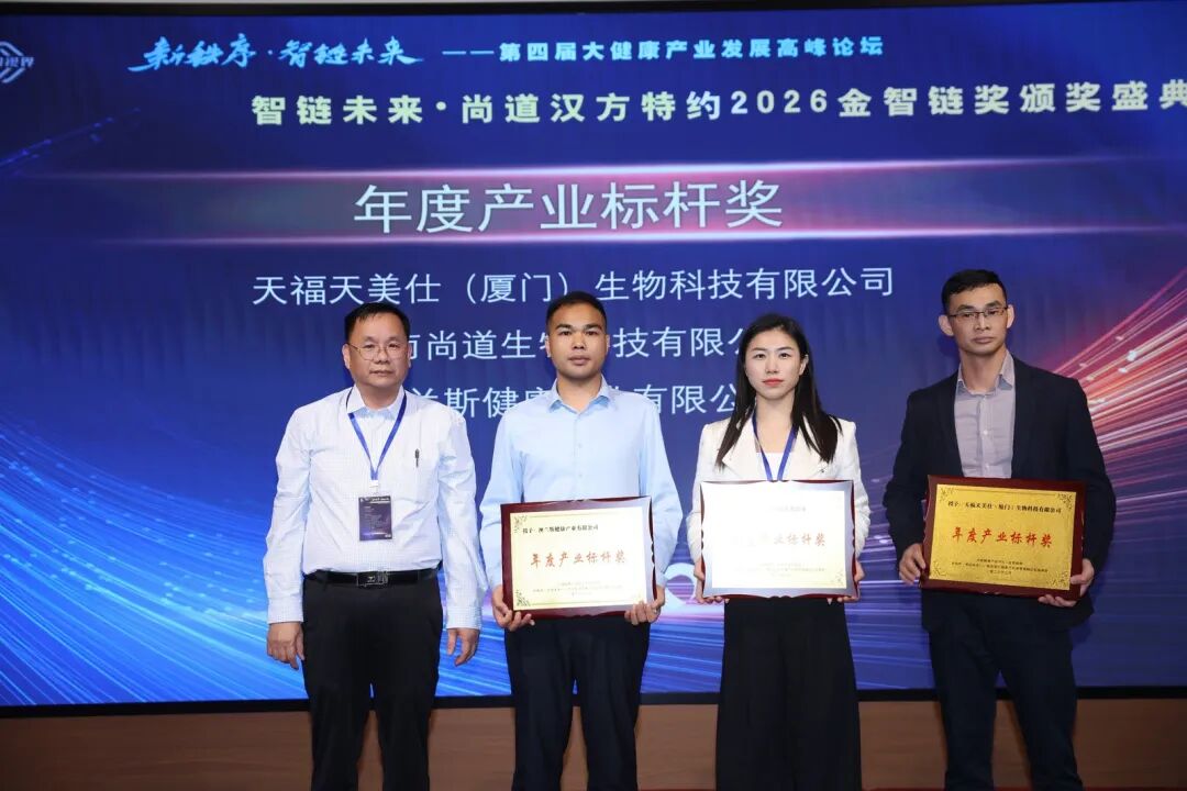 在同步举行的“2026金智链奖颁奖盛典”上,天福天美仕(厦门)生物科技有限公司凭借在产品品质与品牌实力方面的突出表现,荣获“年度产业标杆奖”与“消费者信赖健康产品奖”两项大奖,再次彰显了企业在大健康产业领域的产品实力与行业影响力。