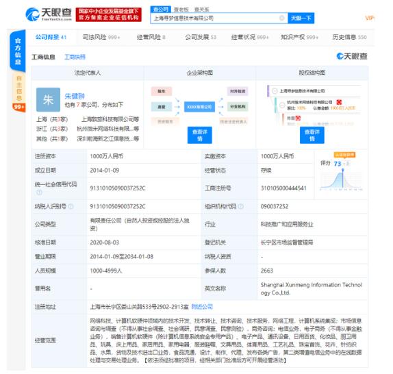 天眼查APP显示,上海寻梦信息技术有限公司成立于2014年1月,注册资本1000万人民币,公司经营范围包括网络科技、计算机软硬件领域内的技术开发、技术转让、技术咨询、技术服务,网络工程、计算机系统集成等,该公司由杭州埃米网络科技有限公司全资持股。