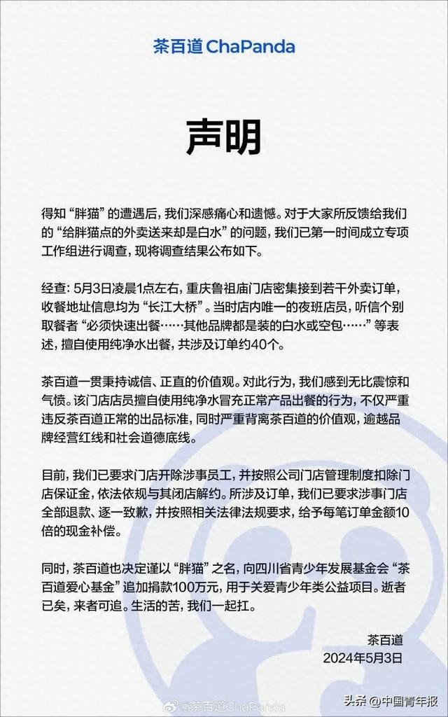 这个五月,茶百道过得很煎熬。先是因“奶茶变白水”受到网民指责,称其不仅欺诈消费者,更是对逝者“胖猫”及其亲友的极大不尊重。面对公众的广泛批评,茶百道迅速采取行动:发布声明、开除涉事员工、与当事门店解约、全部退款、10倍赔偿、捐款100万元。一系列补救措施后,本以为事情会到此为止,没想到却是新一轮风波的开始,而风暴之眼正是茶百道以“胖猫”之名,向四川省青少年发展基金会“茶百道爱心基金”追加的100万元捐款。